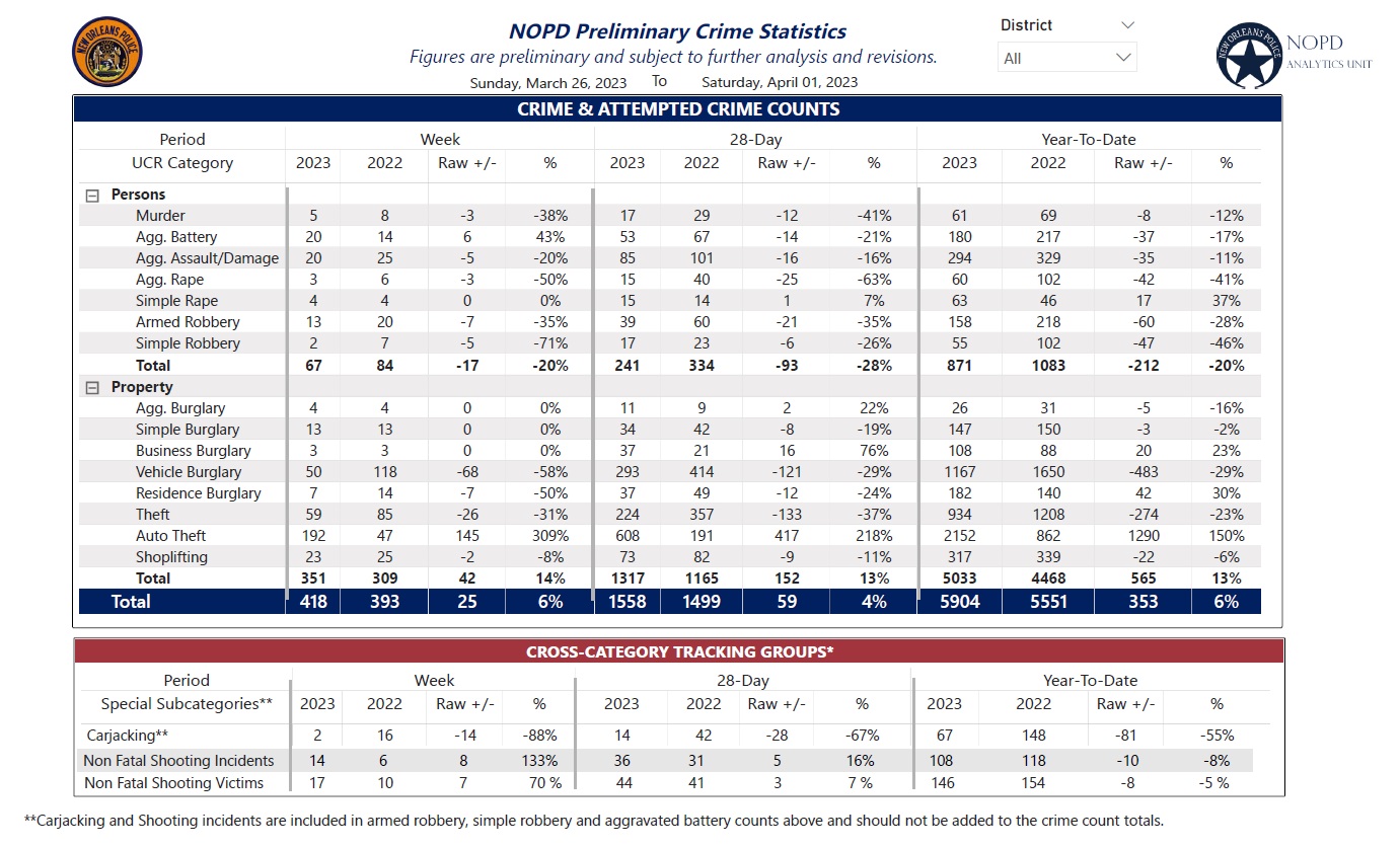 The following is a weekly report of citywide crime statistics compiled by the NOPD Analytics Unit for the period of March 26-April 1, 2023.