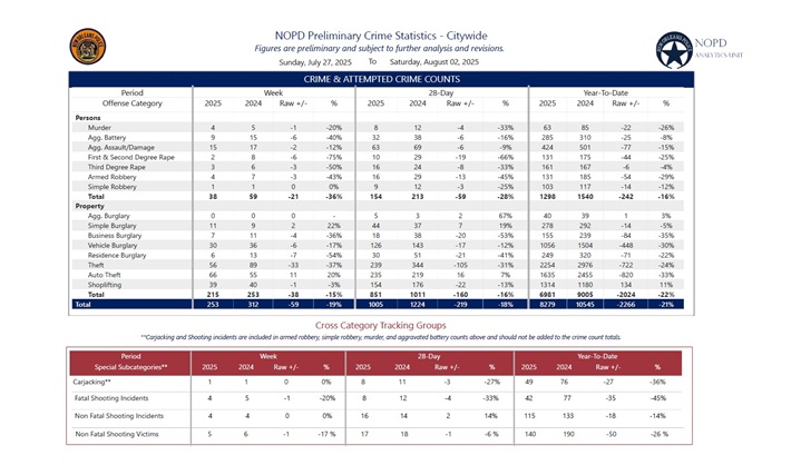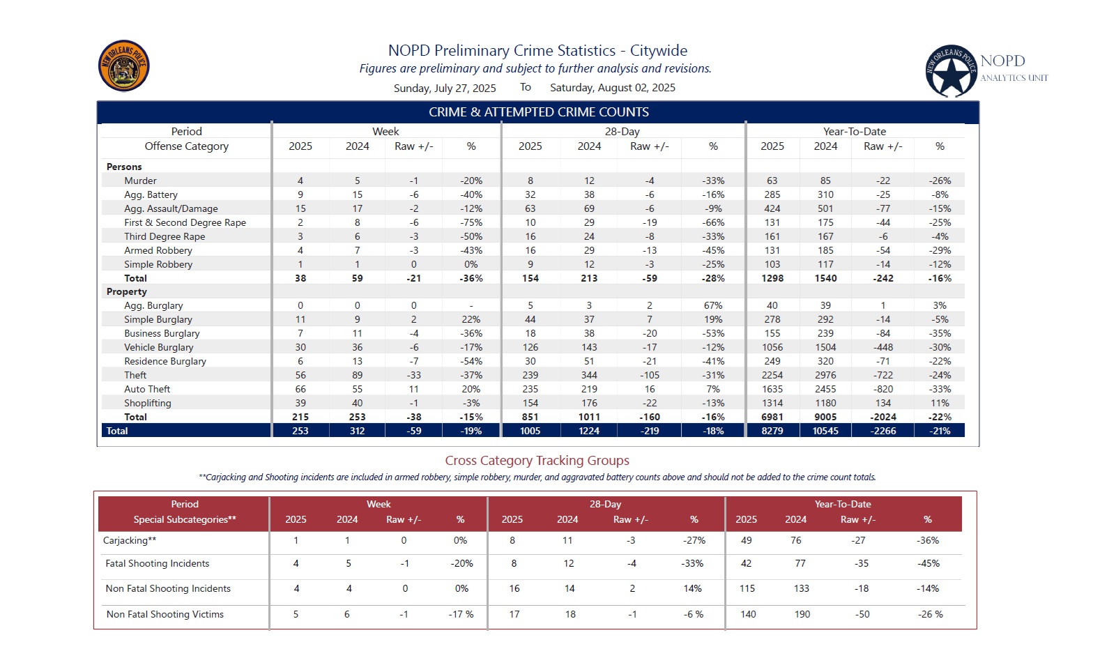 The following is a weekly report of citywide crime statistics compiled by the NOPD Analytics Unit for the period of July 27-August 2, 2025.