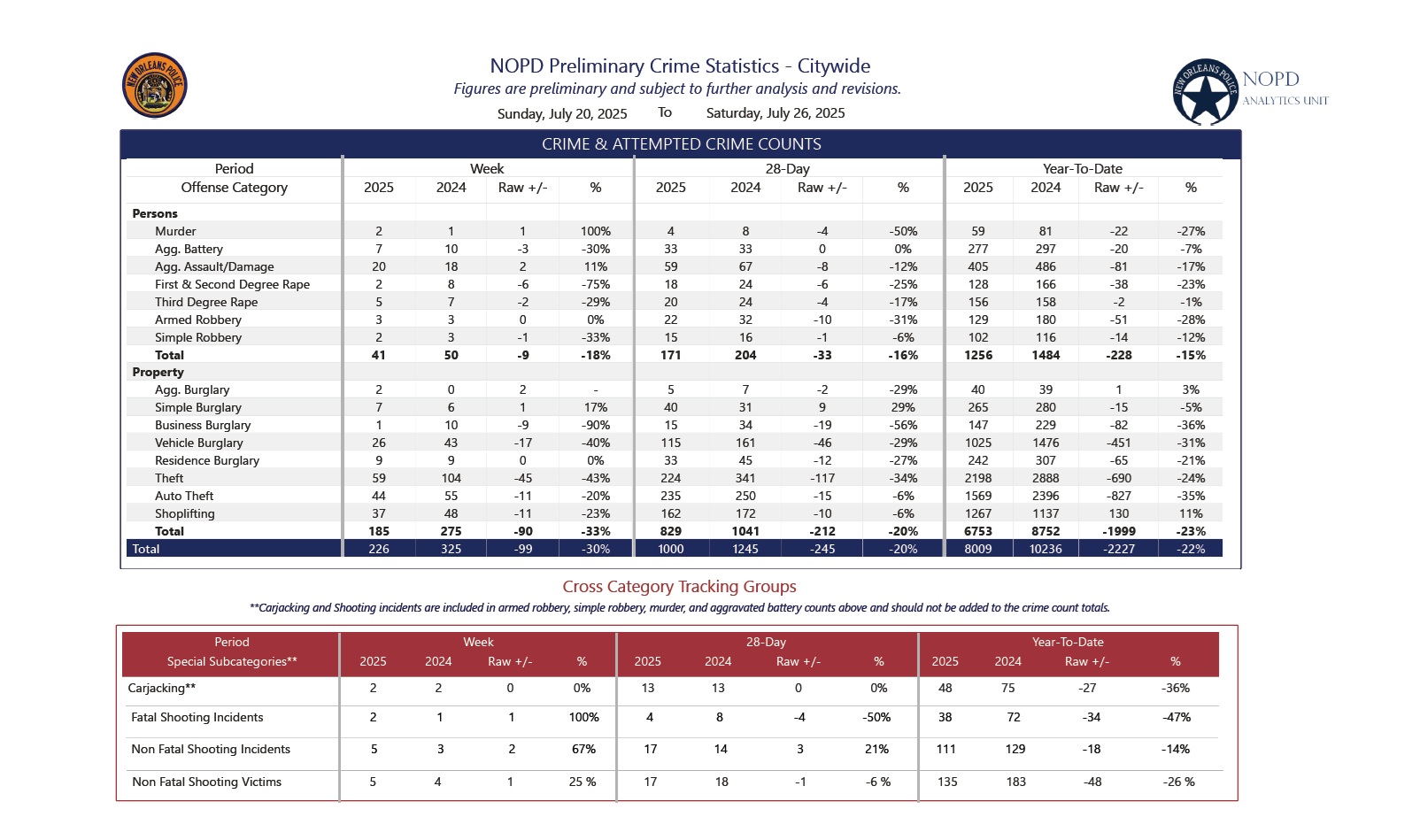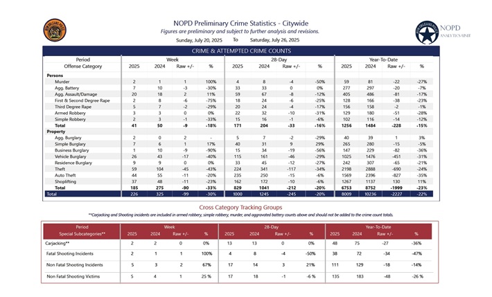 The following is a weekly report of citywide crime statistics compiled by the NOPD Analytics Unit for the period of July 20-26, 2025.