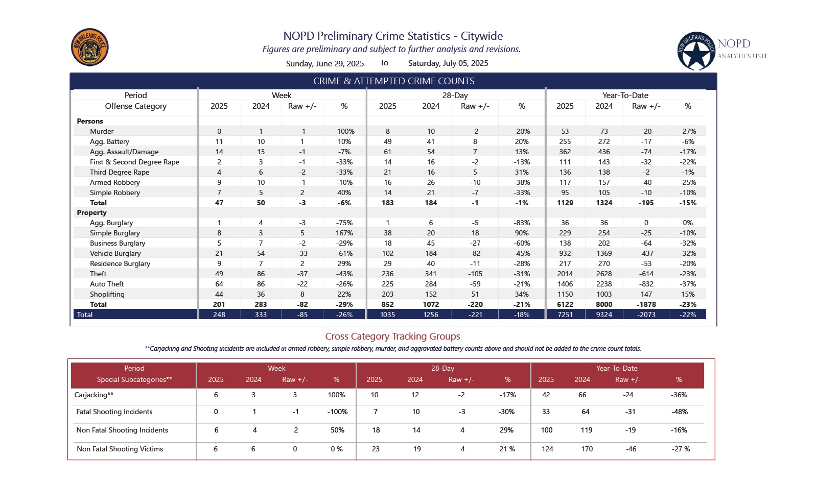 The following is a weekly report of citywide crime statistics compiled by the NOPD Analytics Unit for the period of June 29-July 5, 2025.