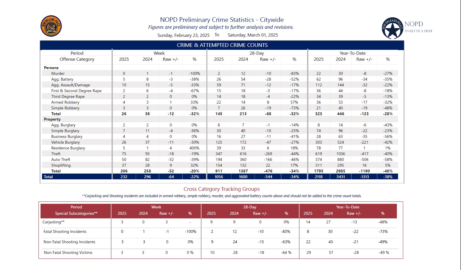The following is a weekly report of citywide crime statistics compiled by the NOPD Analytics Unit for the period of February 23-March 1, 2025.
