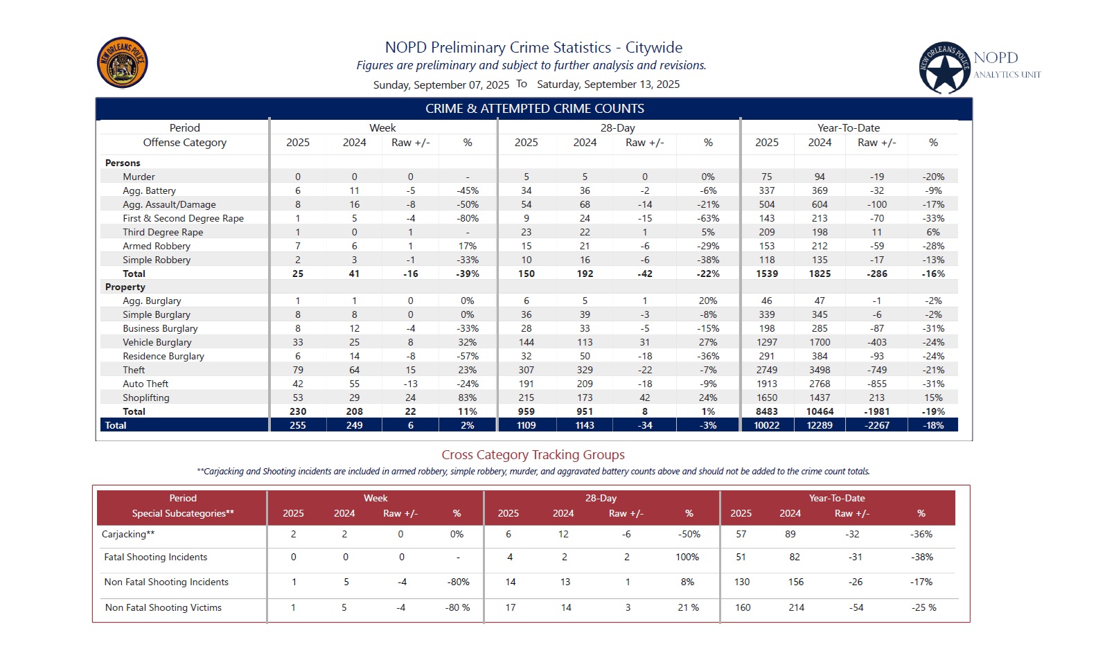 The following is a weekly report of citywide crime statistics compiled by the NOPD Analytics Unit for the period of September 7-13, 2025.